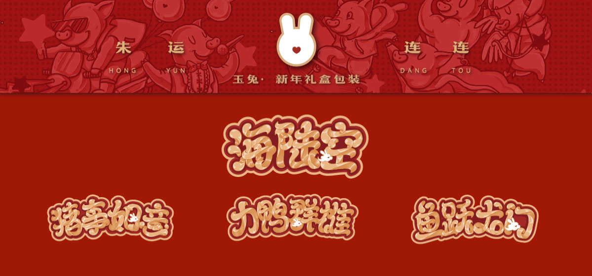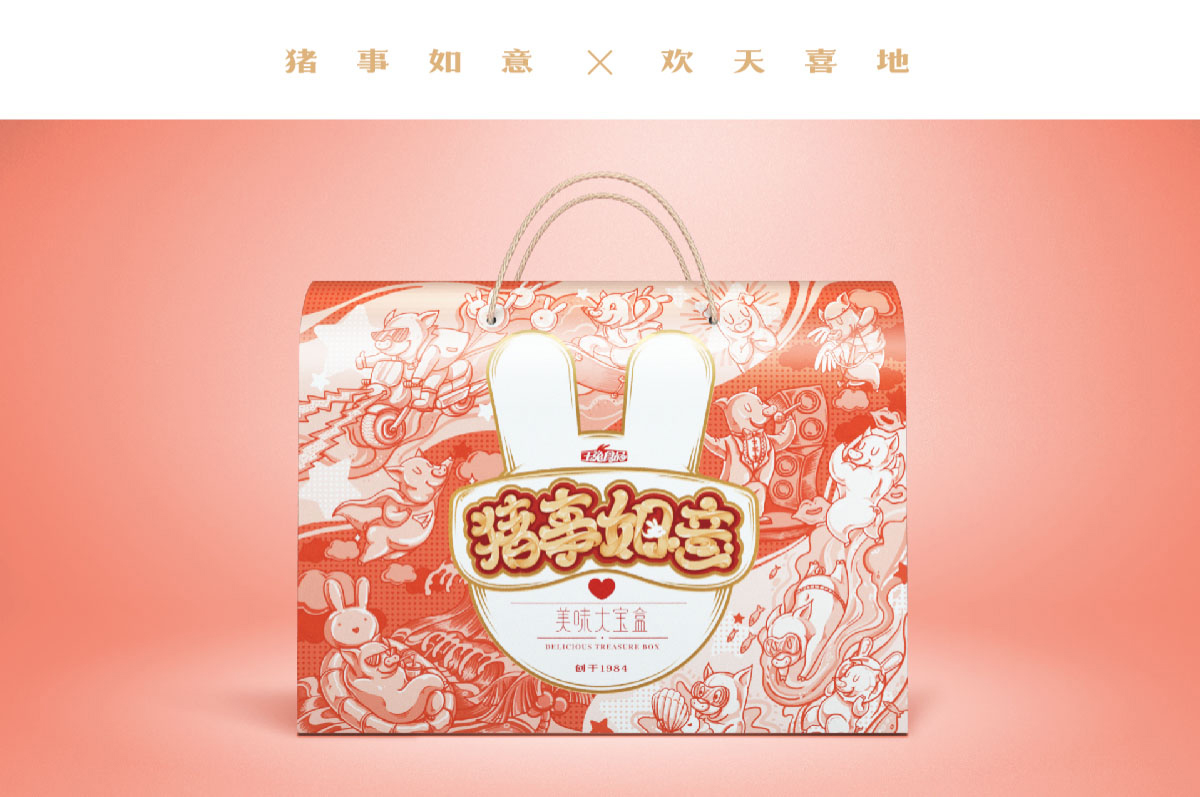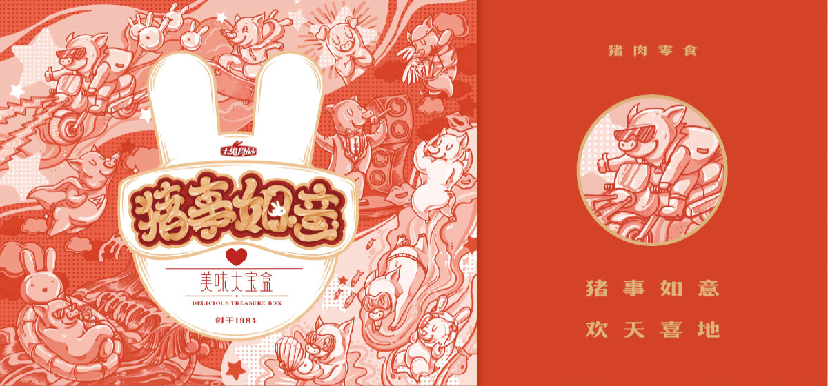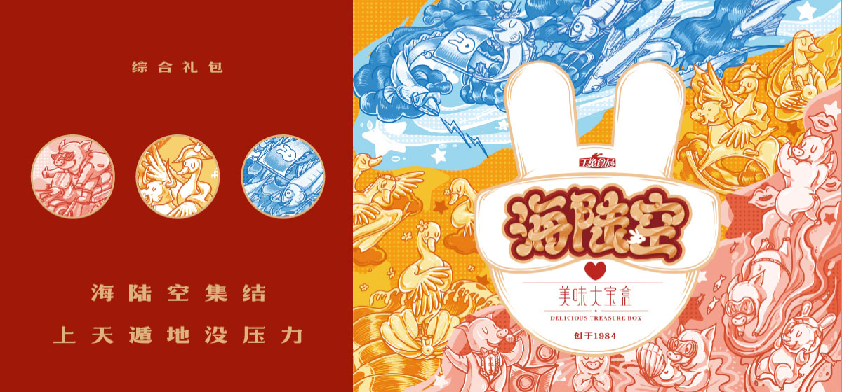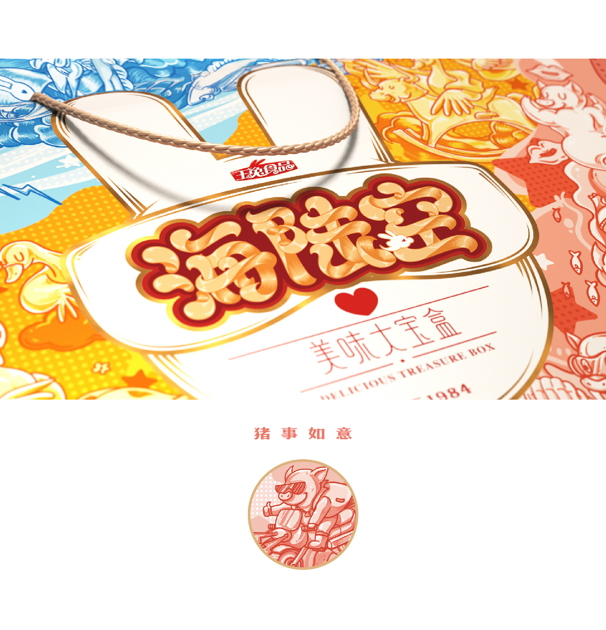 豬事如意,歡天喜地;力壓群雄、屬我最靚;魚躍龍門,翻江倒海;創作了3幅以地上跑的天上飛的海里游的美味主題插畫,美味大寶盒寓意明確。