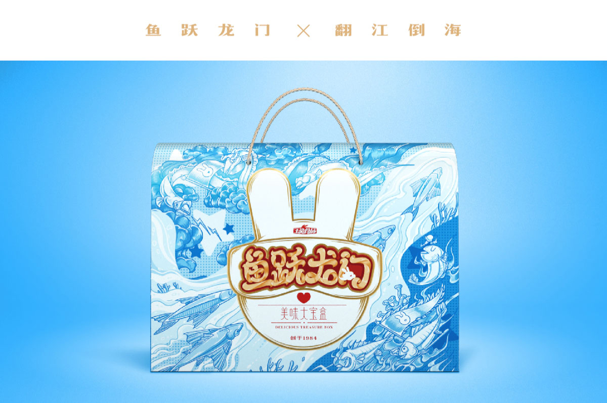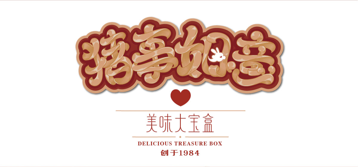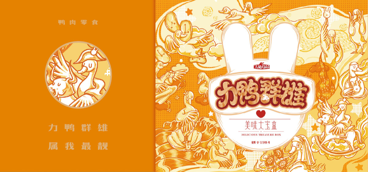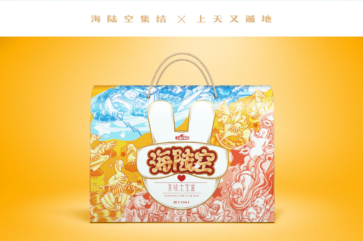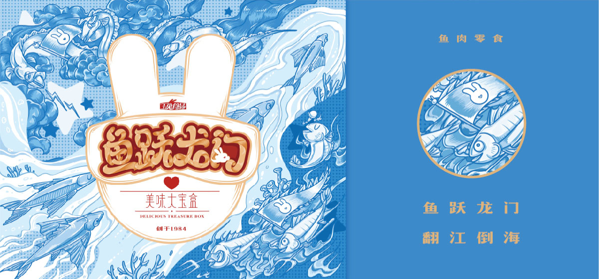 豬事如意,歡天喜地;力壓群雄、屬我最靚;魚躍龍門,翻江倒海;創作了3幅以地上跑的天上飛的海里游的美味主題插畫,美味大寶盒寓意明確。