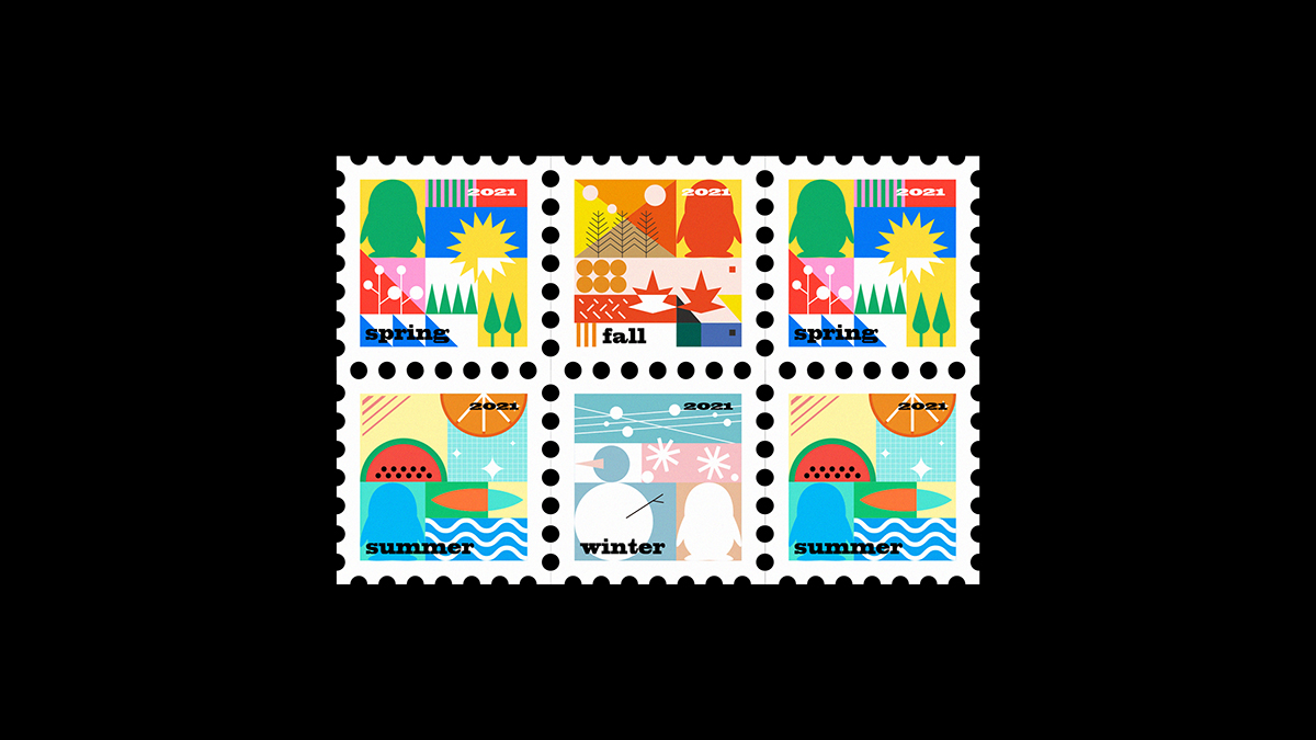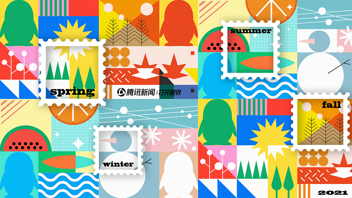 騰訊新聞日常禮品禮盒內含眼鏡棉片和蒸汽眼罩。眼鏡棉片的設計采用蒙德里安的色塊拼接風格,把不同季節的主題用幾何圖形的方式抽象地概括出來,整體采用撞色拼接的形式,圖案明亮豐富。形式上設計成四季郵票形式,展現春夏秋冬的風景,擦亮的鏡片讓你可以把四季風景收藏在心中。