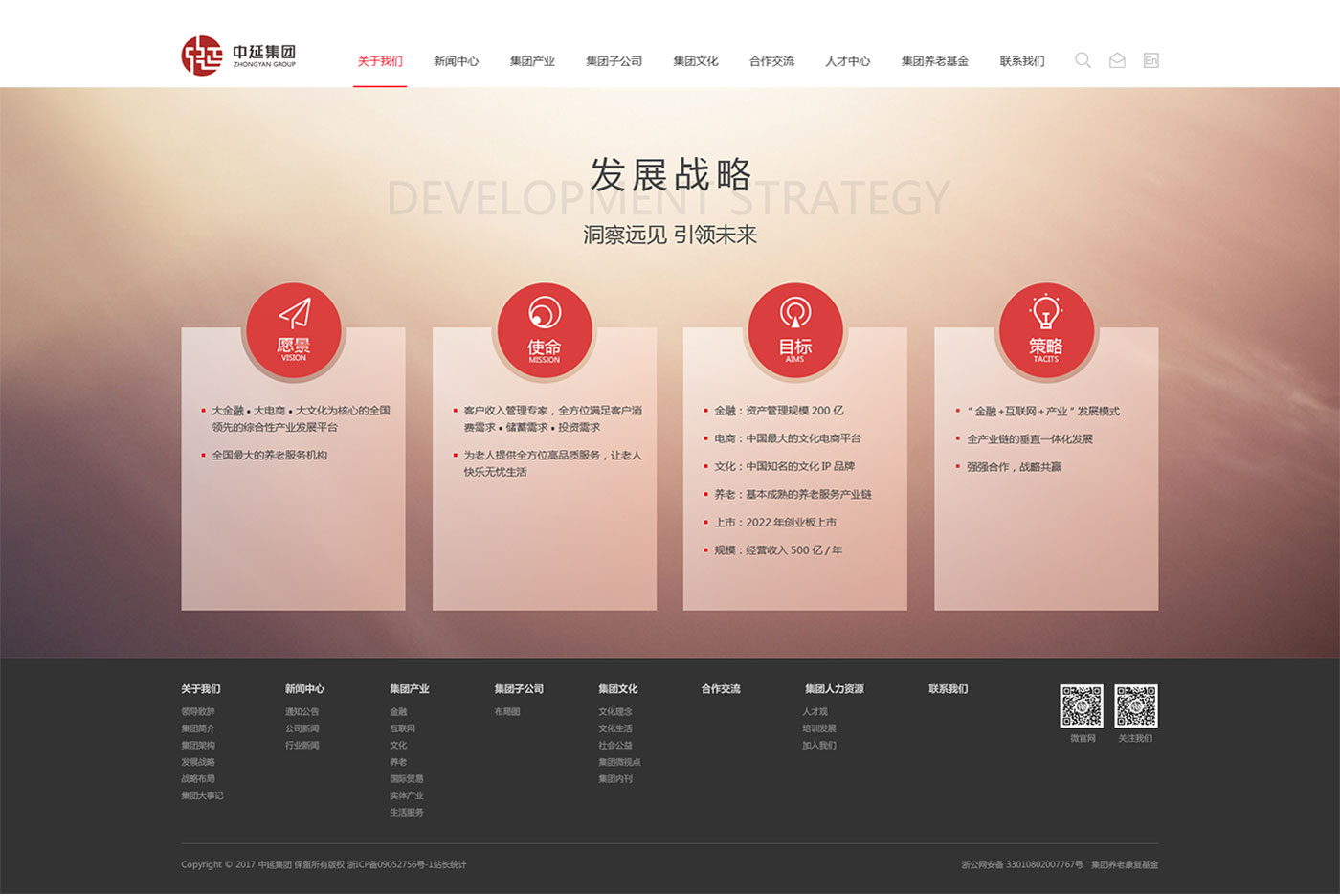 某集團(tuán)是一家積極開拓產(chǎn)業(yè)跨界融合創(chuàng)新發(fā)展模式,多元化、綜合性的企業(yè)集團(tuán),業(yè)務(wù)涵蓋互聯(lián)網(wǎng)、文化、證券、養(yǎng)老、國(guó)際貿(mào)易、生活服務(wù)等領(lǐng)域。“中為魂,延無界”是某集團(tuán)的核心理念。根植于中國(guó)文化,某集團(tuán)始終堅(jiān)持自己的發(fā)展方向和目標(biāo),保持一顆敬畏之心,不斷學(xué)習(xí)進(jìn)步,突破創(chuàng)新,打造自己的核心競(jìng)爭(zhēng)力,無限延伸發(fā)展,保持穩(wěn)健與定力,基業(yè)長(zhǎng)青。