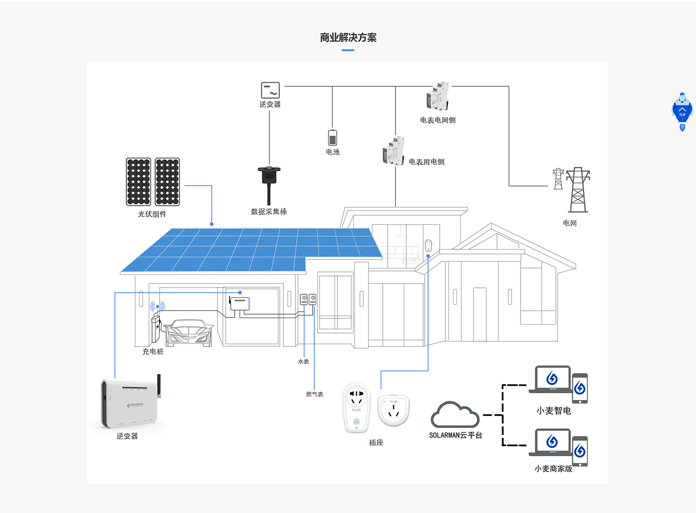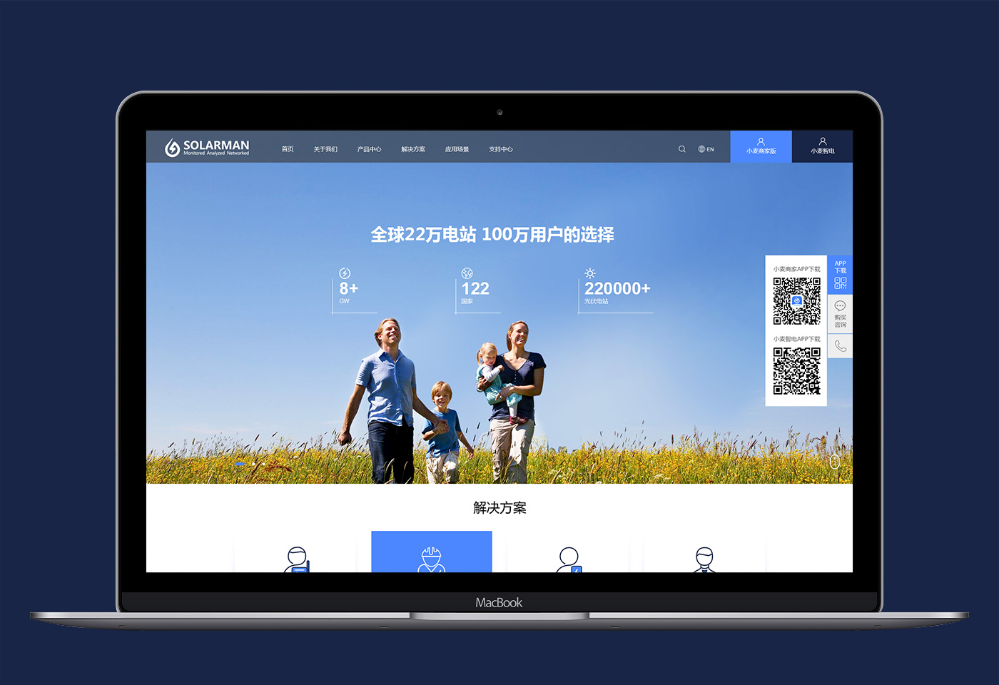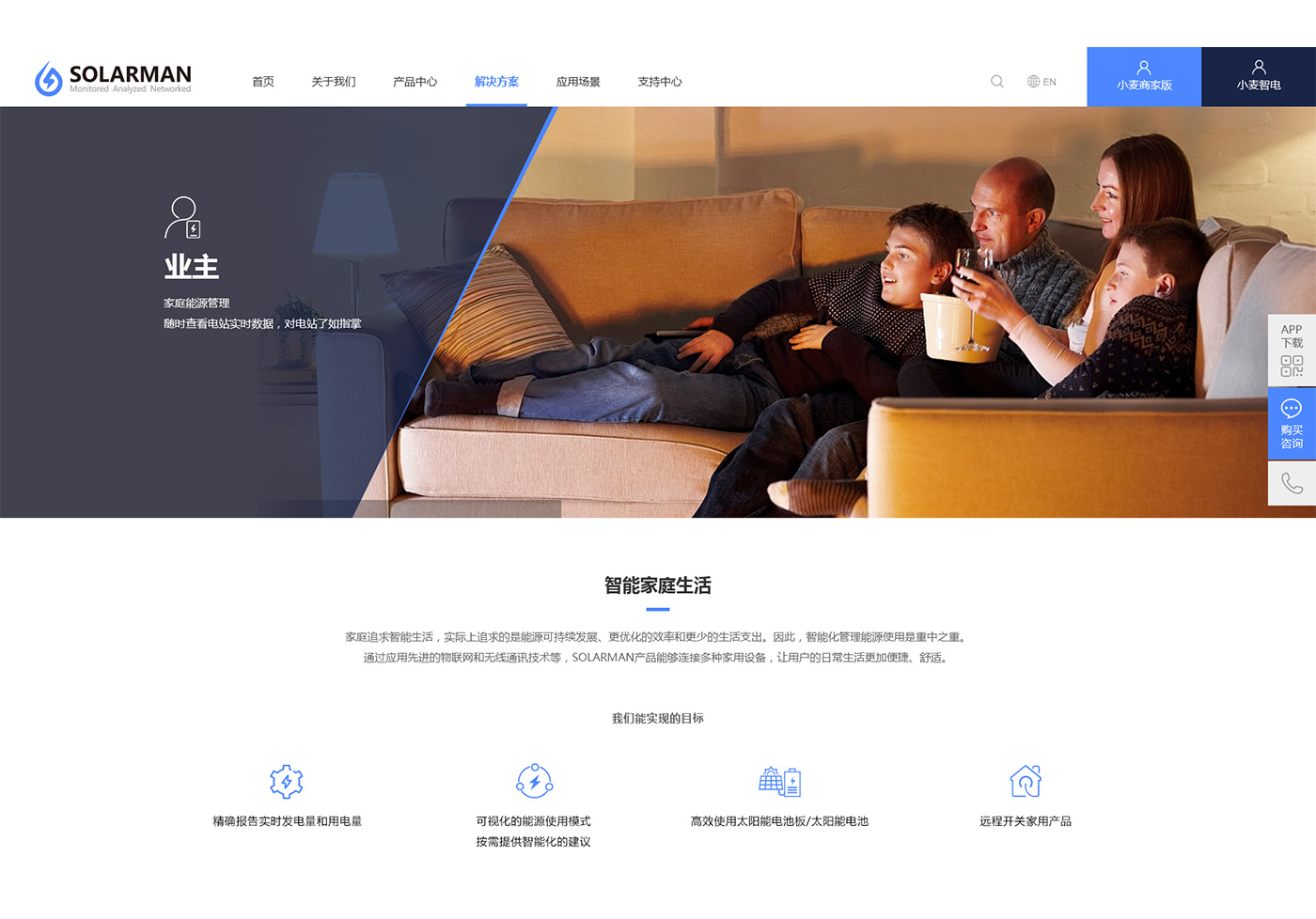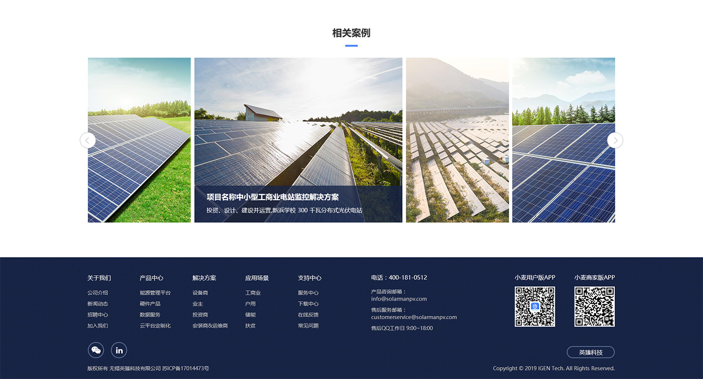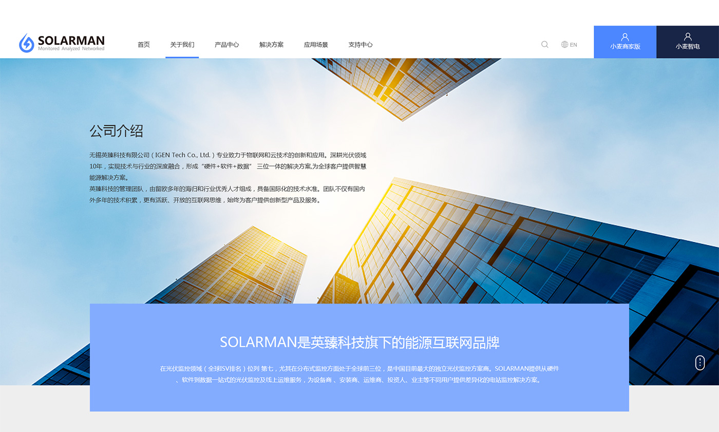 分析英臻是一家以科技能源為主的科技企業,主要以太陽能發電到電能管理,網站整體風格以簡潔科技環保的風格來體現,以藍色為主色調。網站通過實物圖片和虛擬二維場景來體現物聯的概念,使現實場景和智能管理相結合,網站統一的圖標風格使視覺效果更加精致和簡潔。