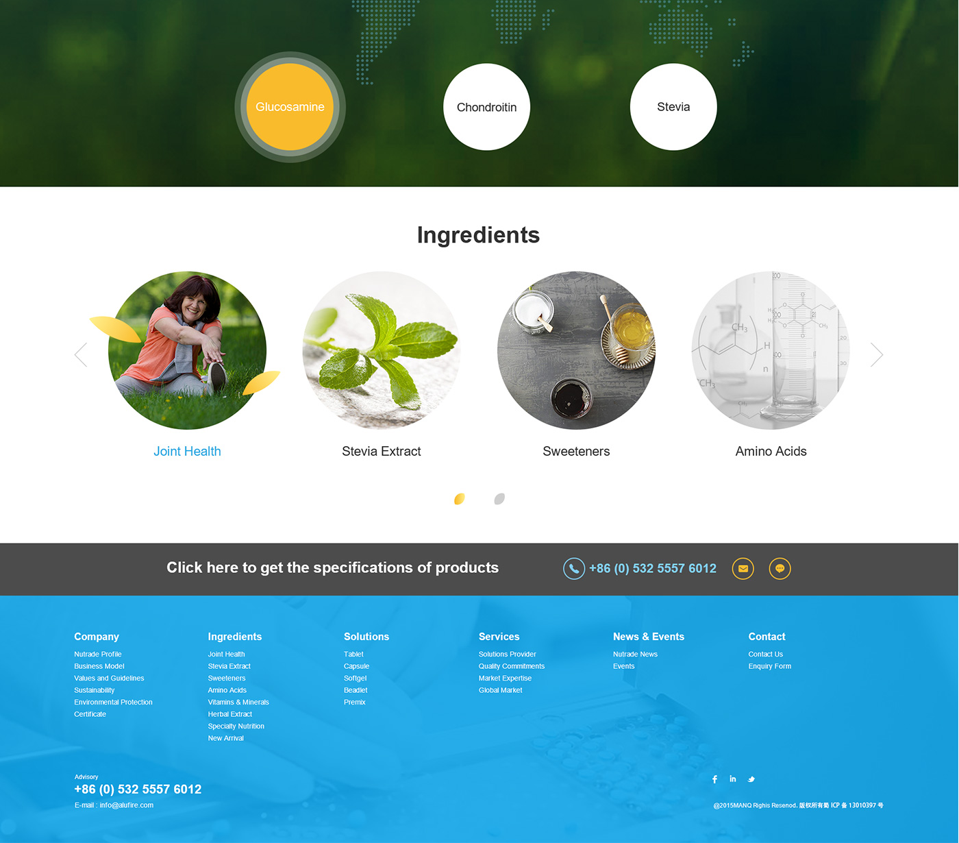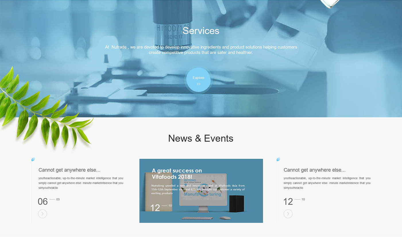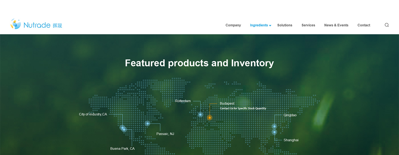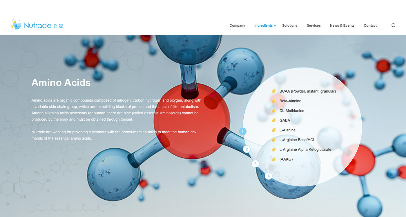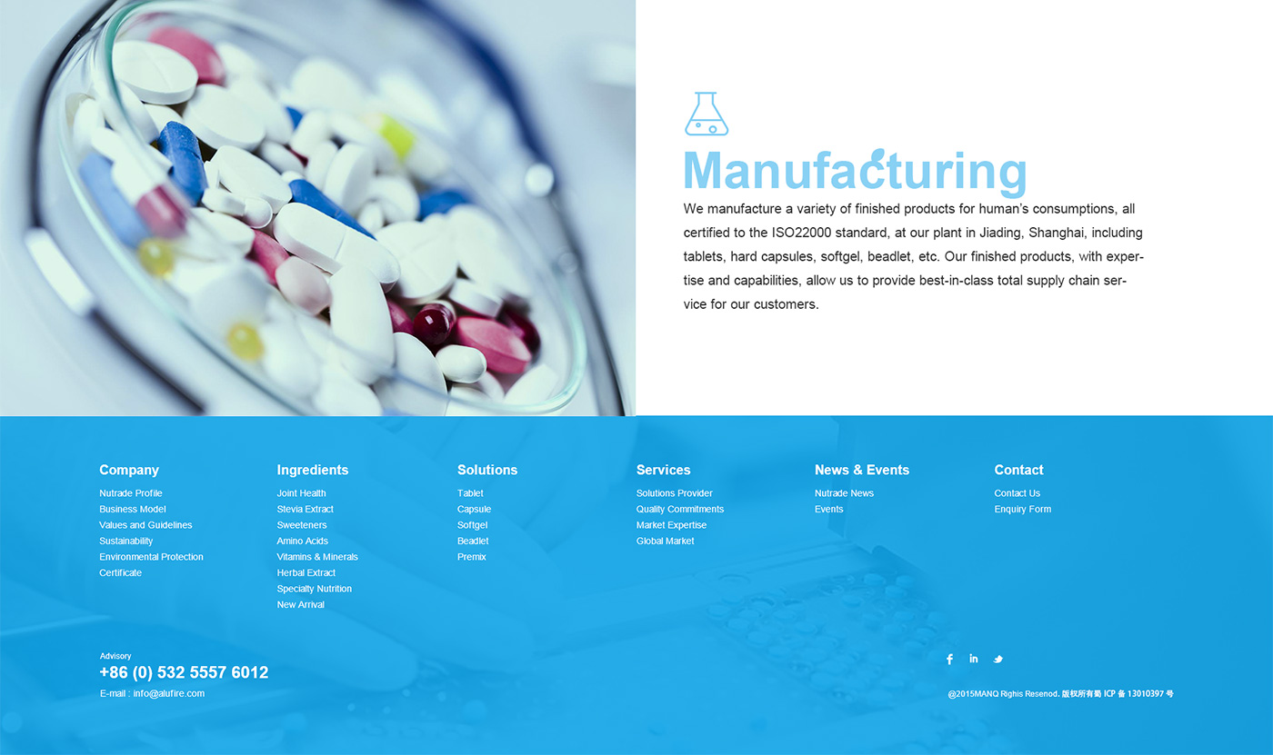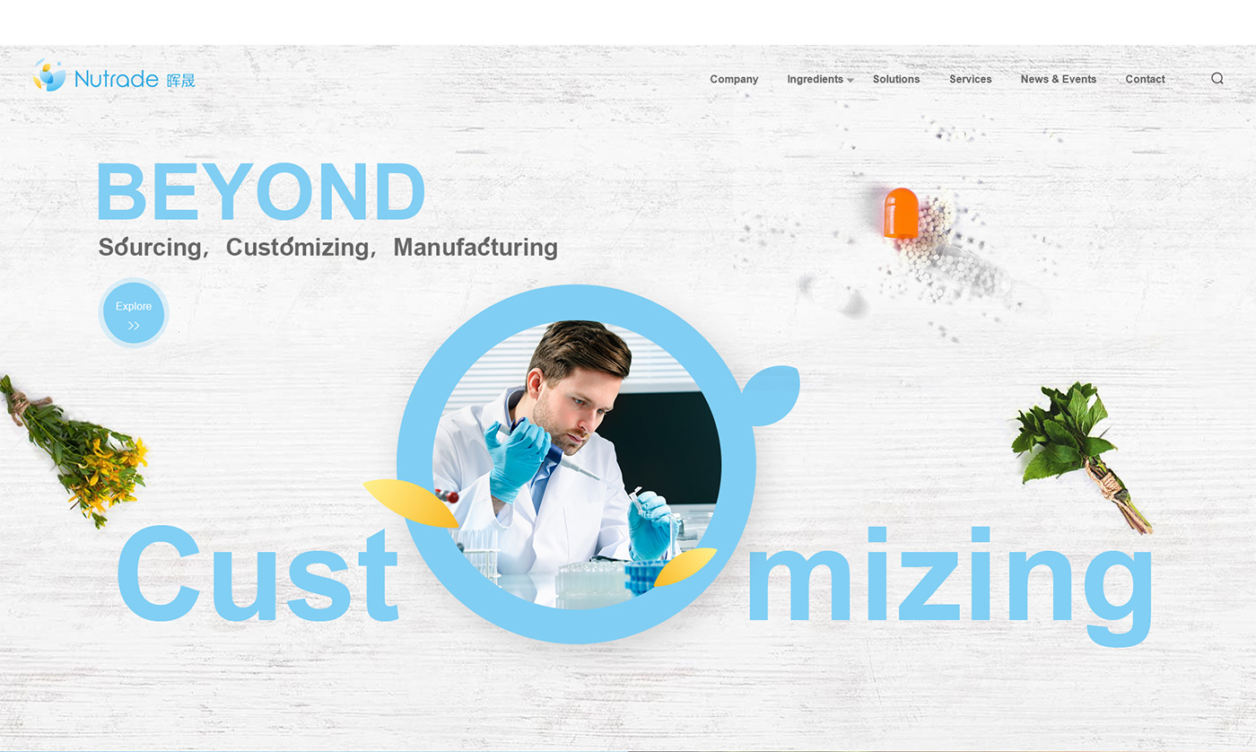 面對海外要企業,網站首頁廣告圖以貫穿暉昇制藥從原料到成品的過程,網站體現暉昇制藥從原料的選材和成份的提煉到成型和包裝。