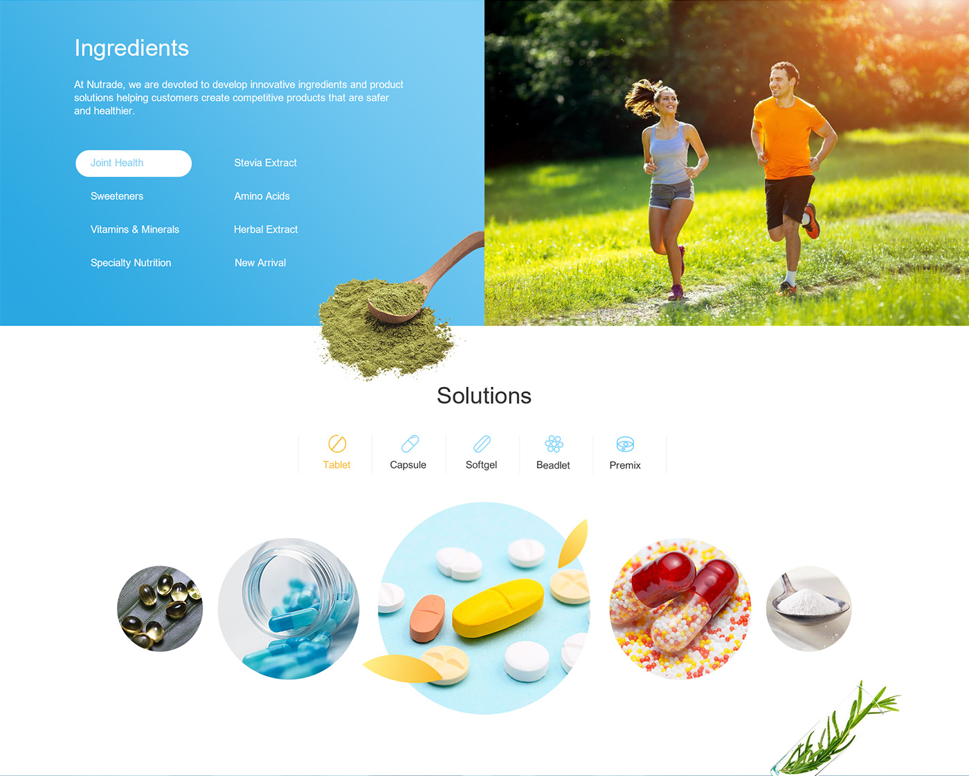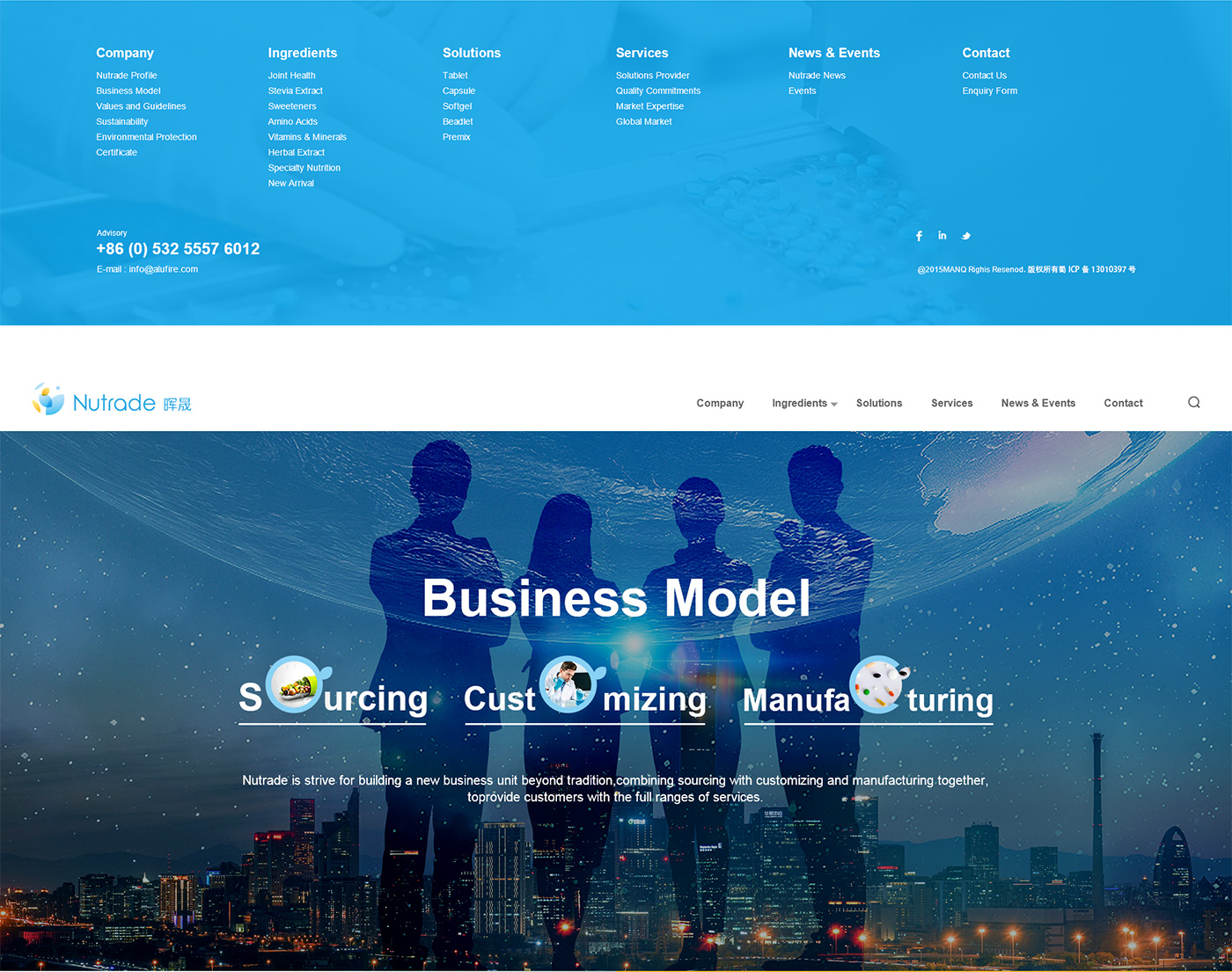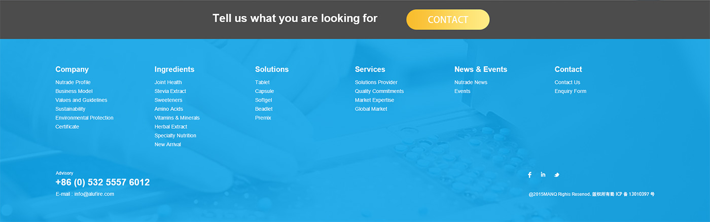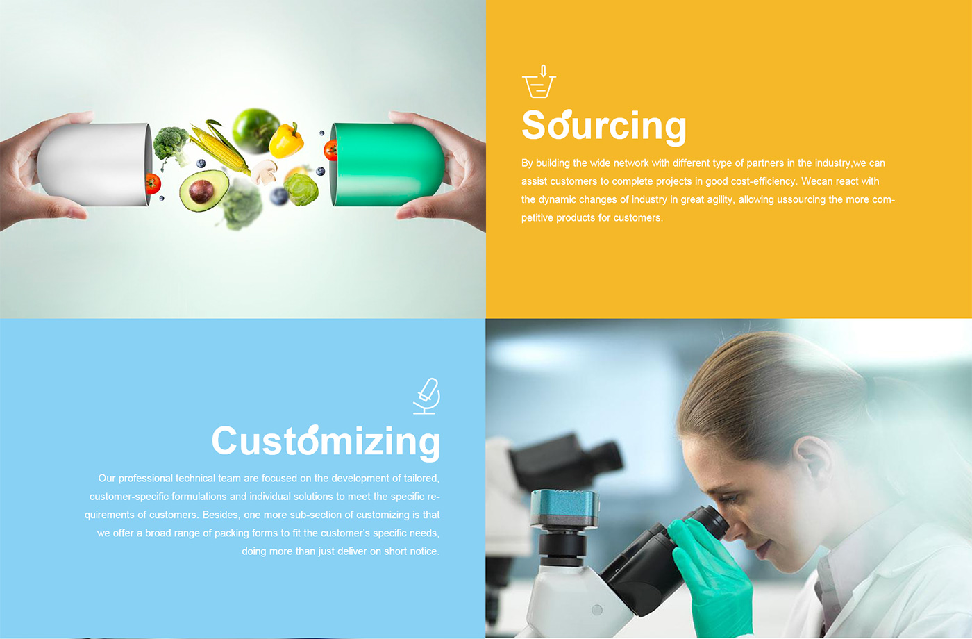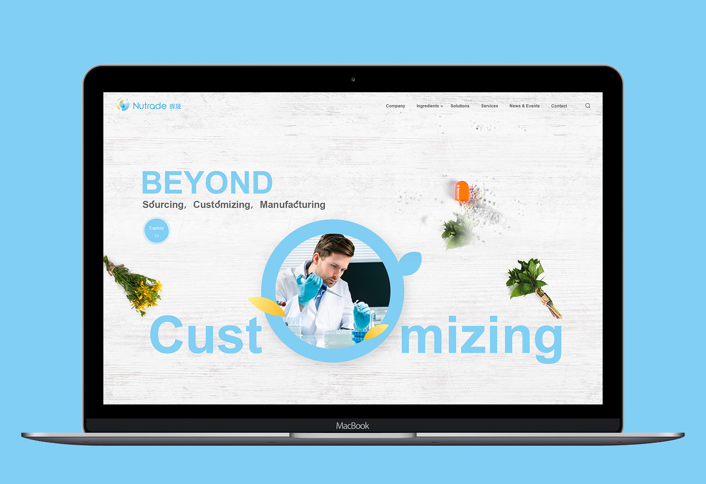 面對海外要企業,網站首頁廣告圖以貫穿暉昇制藥從原料到成品的過程,網站體現暉昇制藥從原料的選材和成份的提煉到成型和包裝。
